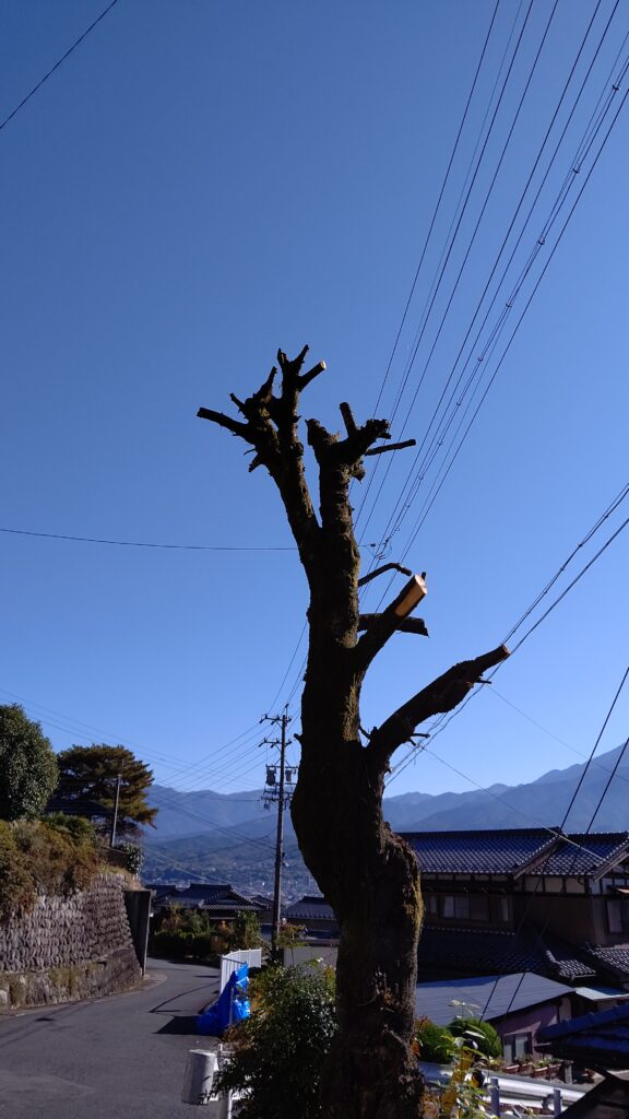 枝が電線に掛かって危険とのことで従業員を連れて区長さんと2時間程度散髪しました。